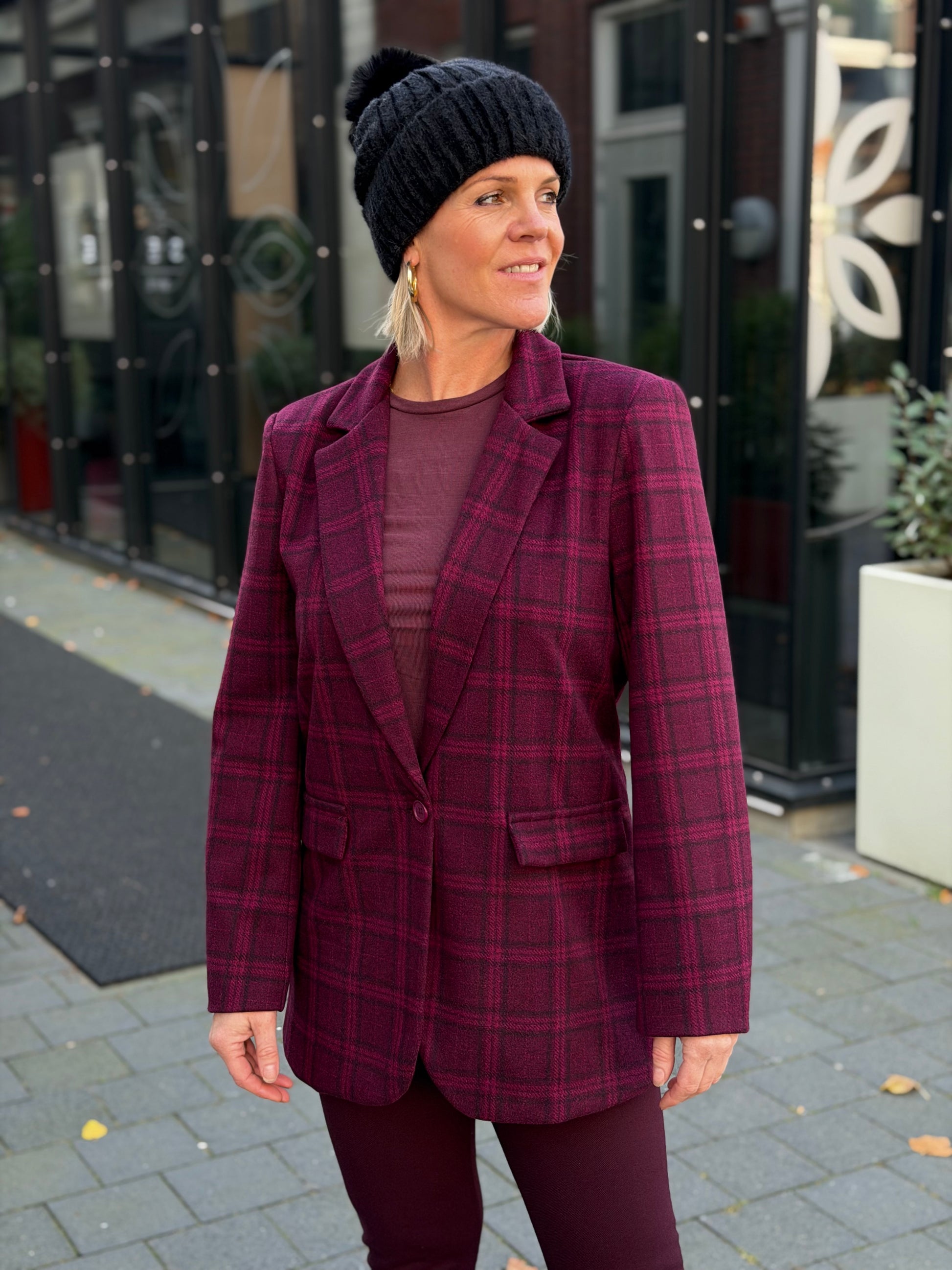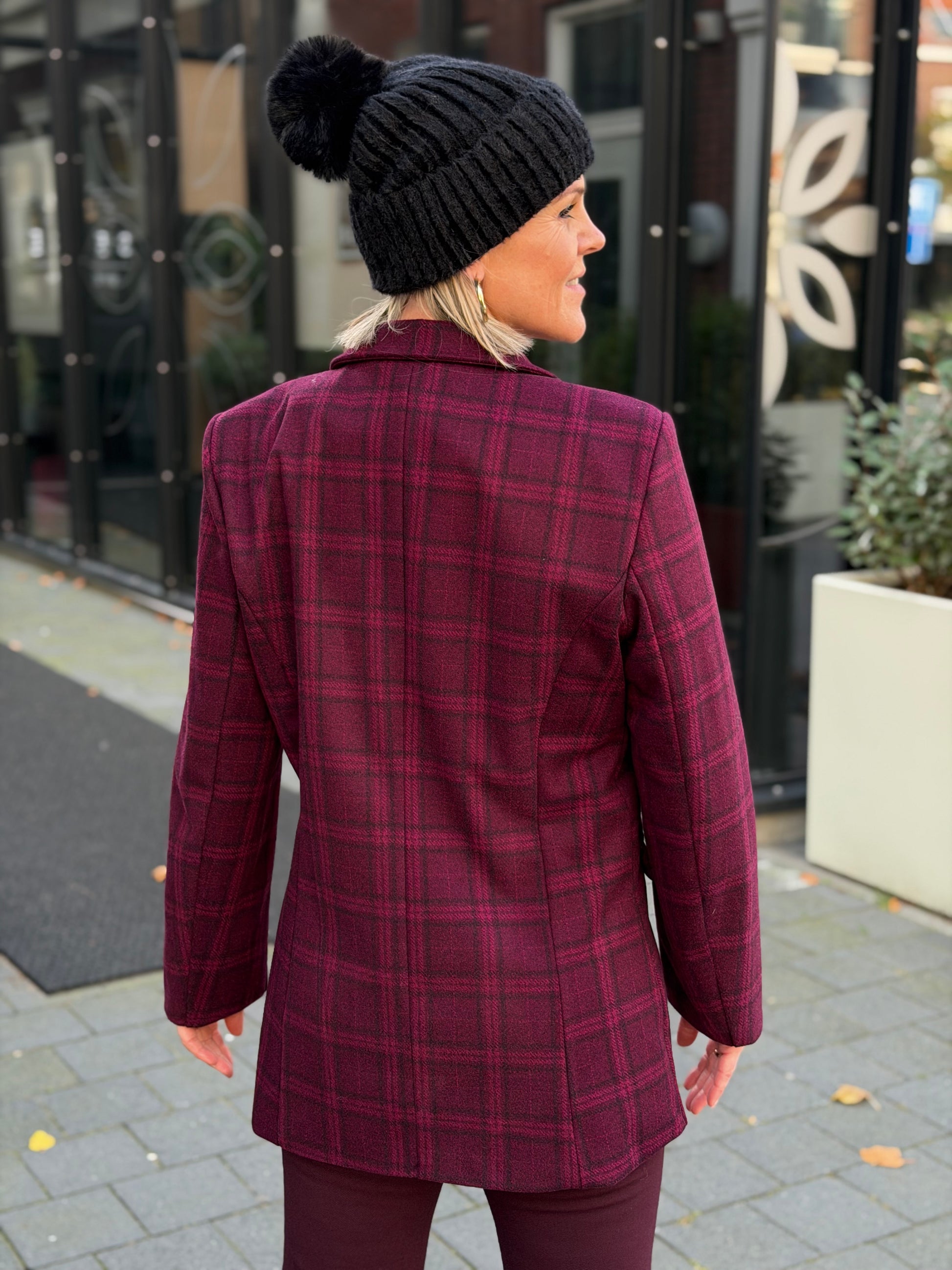 Toffe wol look blazer met ruit patroon in Bordeaux en aubergine tinten. Passende blazer met enkele knoopsluiting