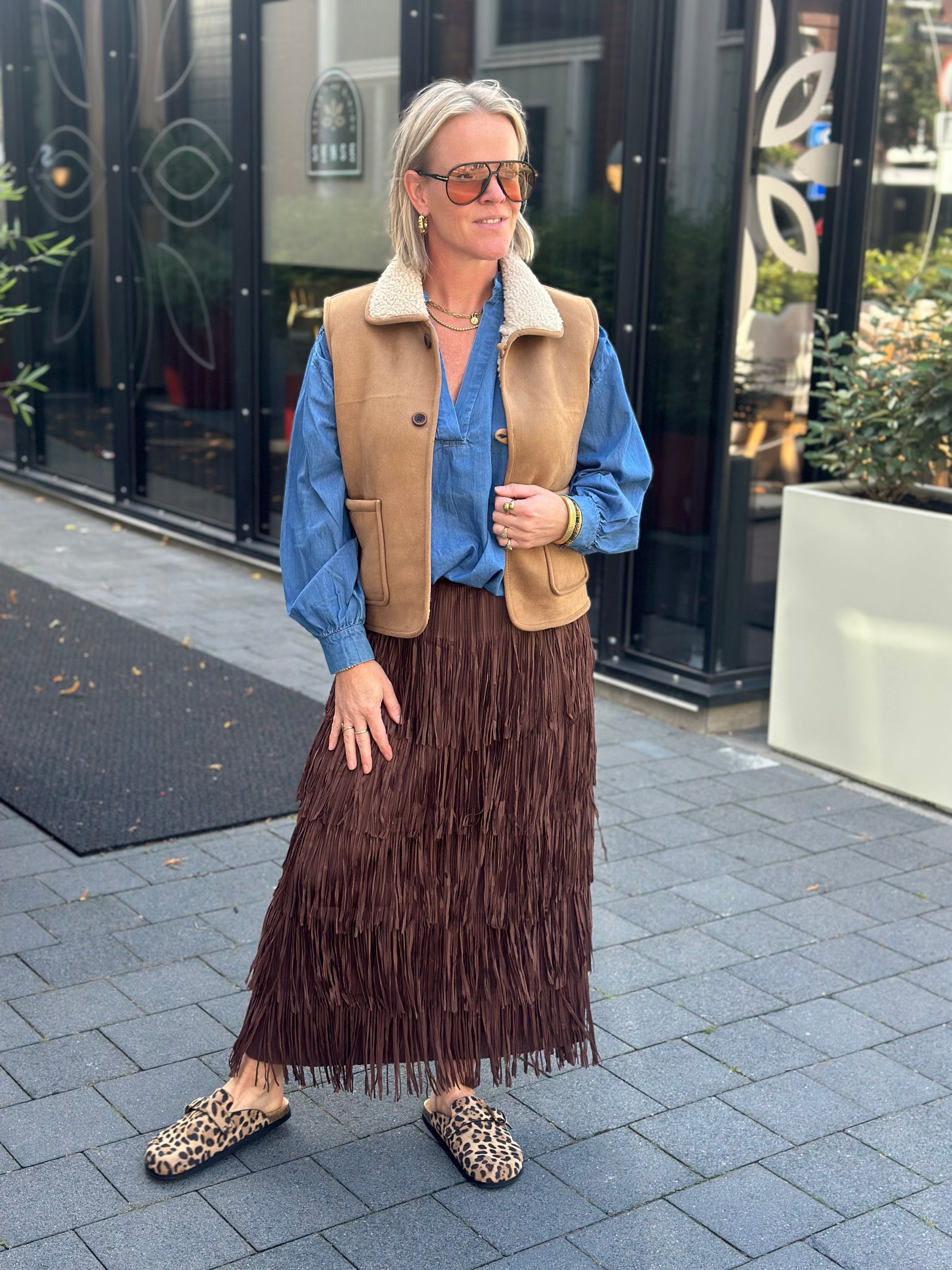 Toffe denim blouse met leuke gerimpeld schouder detail. De perfecte basis blouse