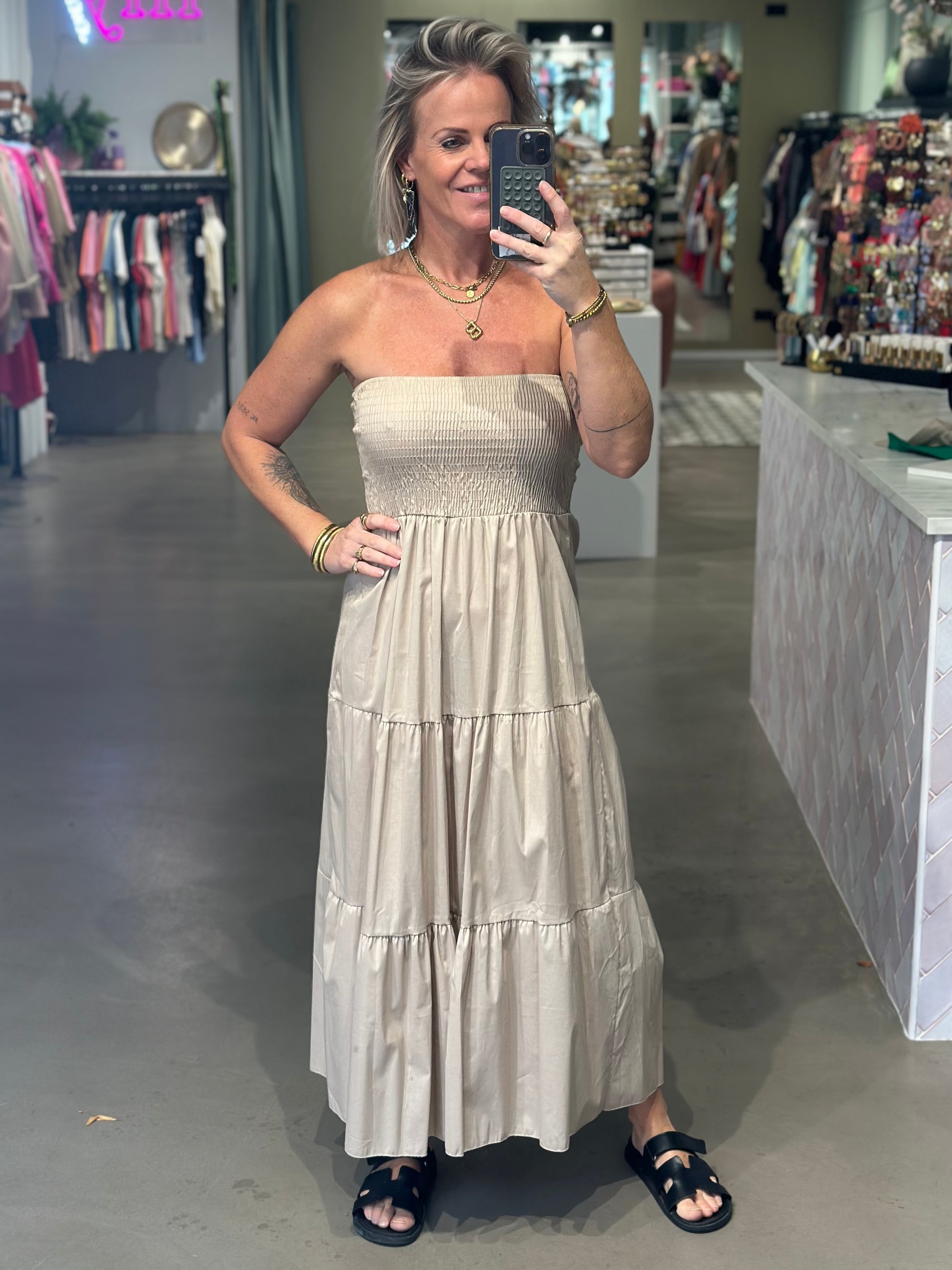 Mooie strapless jurk gemaakt van katoen. Ideaal voor een dagje strand. Maar ook zeker leuk als je daarna aanschuift aan het diner