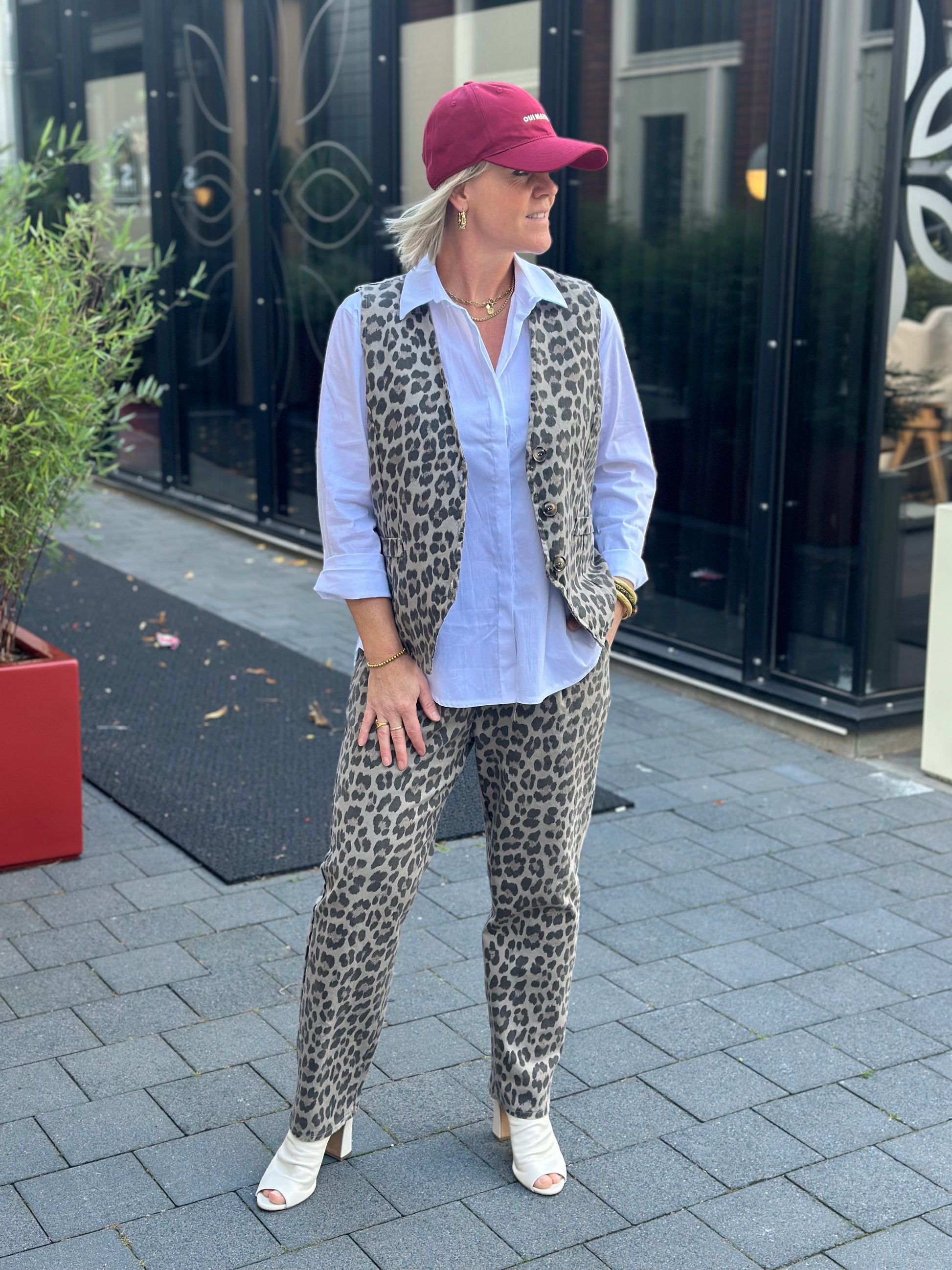 Helemaal hip met dit toffe denim Gillet met Leopard print. Combineer met matching broek