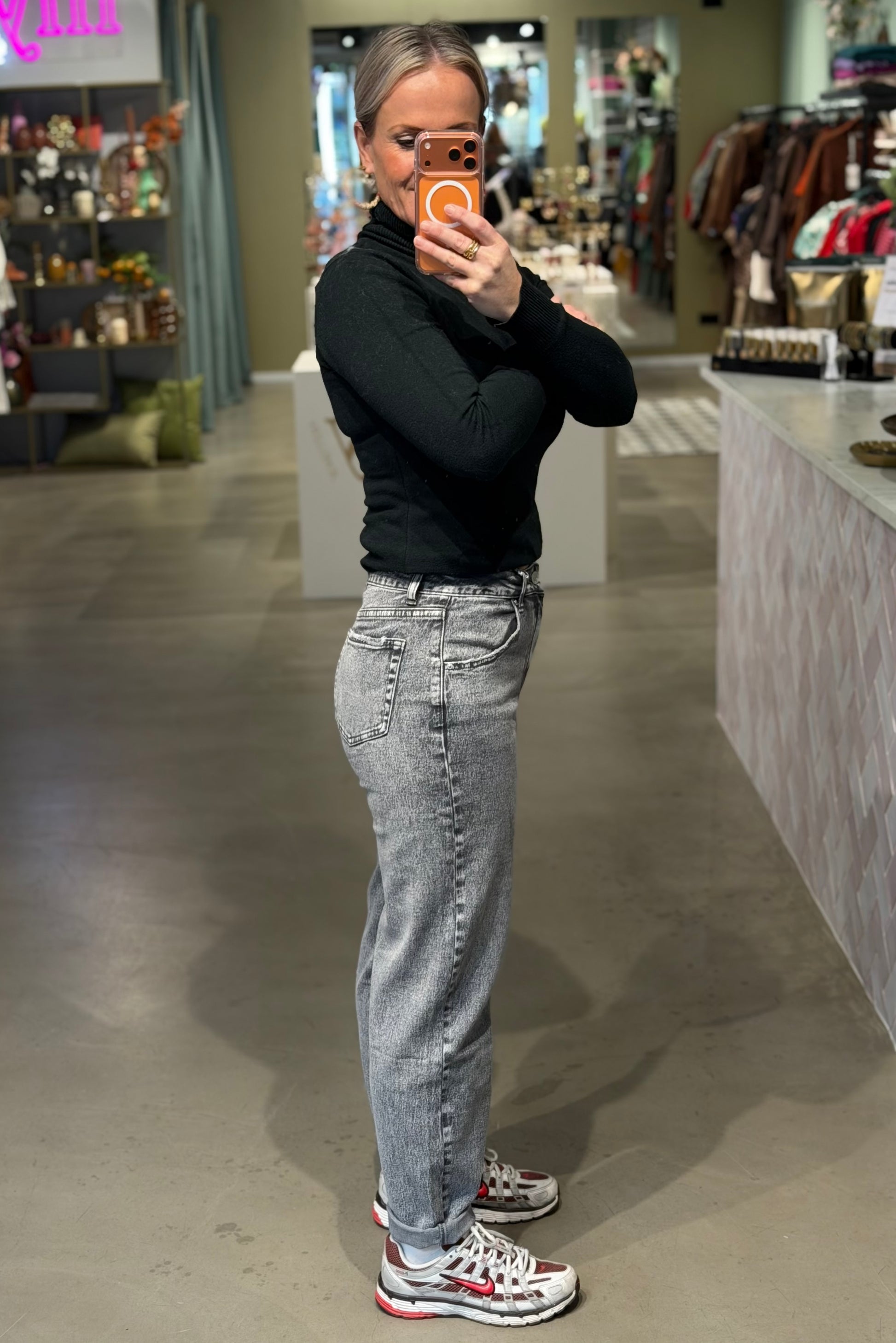 De populaire mom fit jeans met veel stretch. De broek heeft een mooie pasvormen en valt iets hoger in de taille.