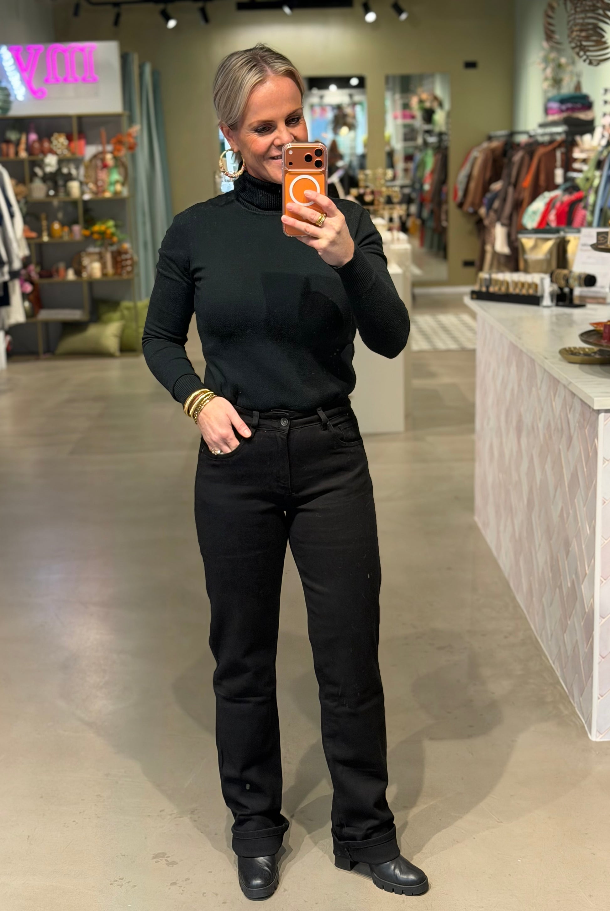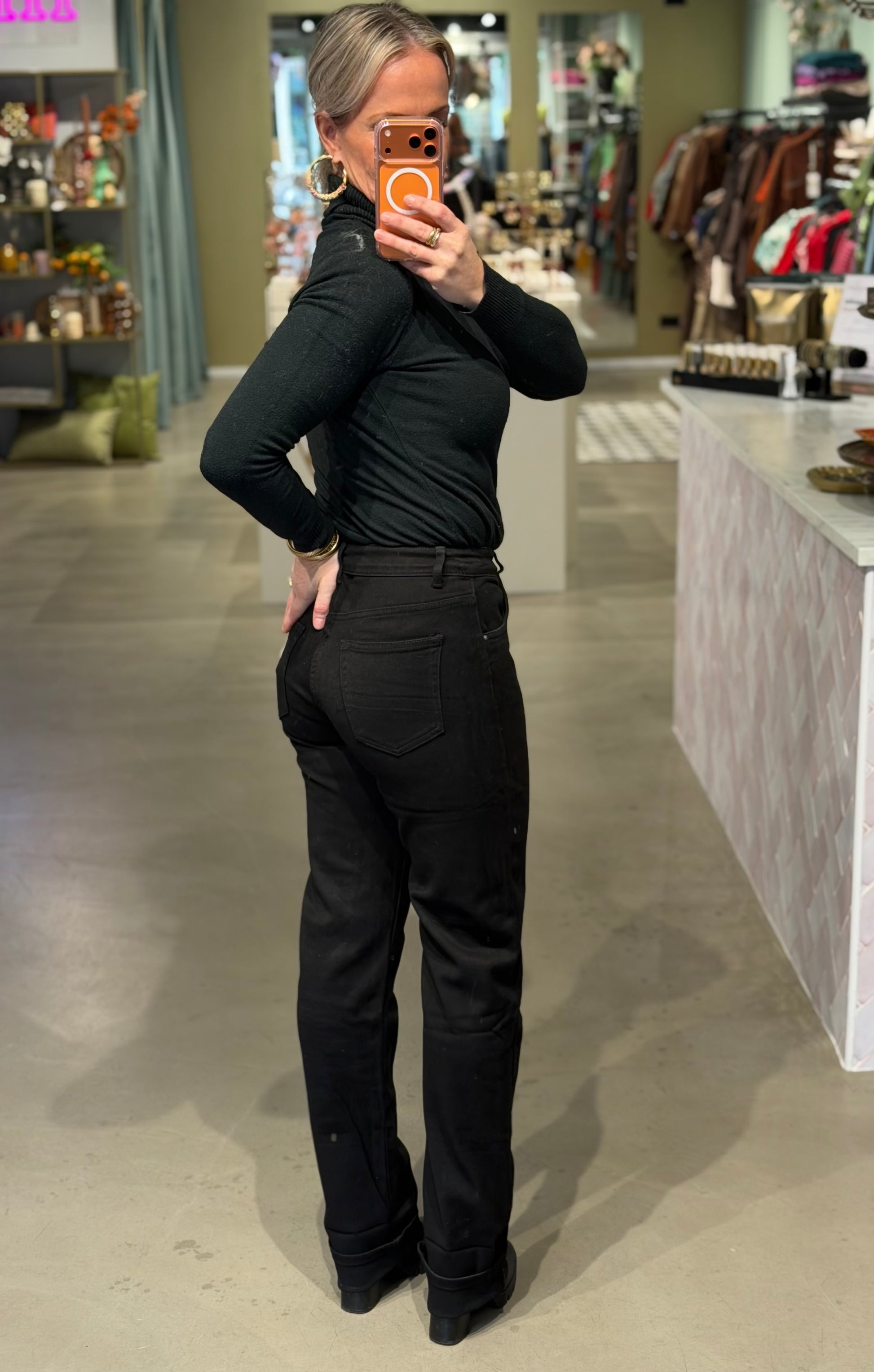 Mooie zwarte straight leg jeans met veel stretch en omslag. De broek heeft een mooie rechte pasvorm en valt iets hoger in de taille. Extra lange fit