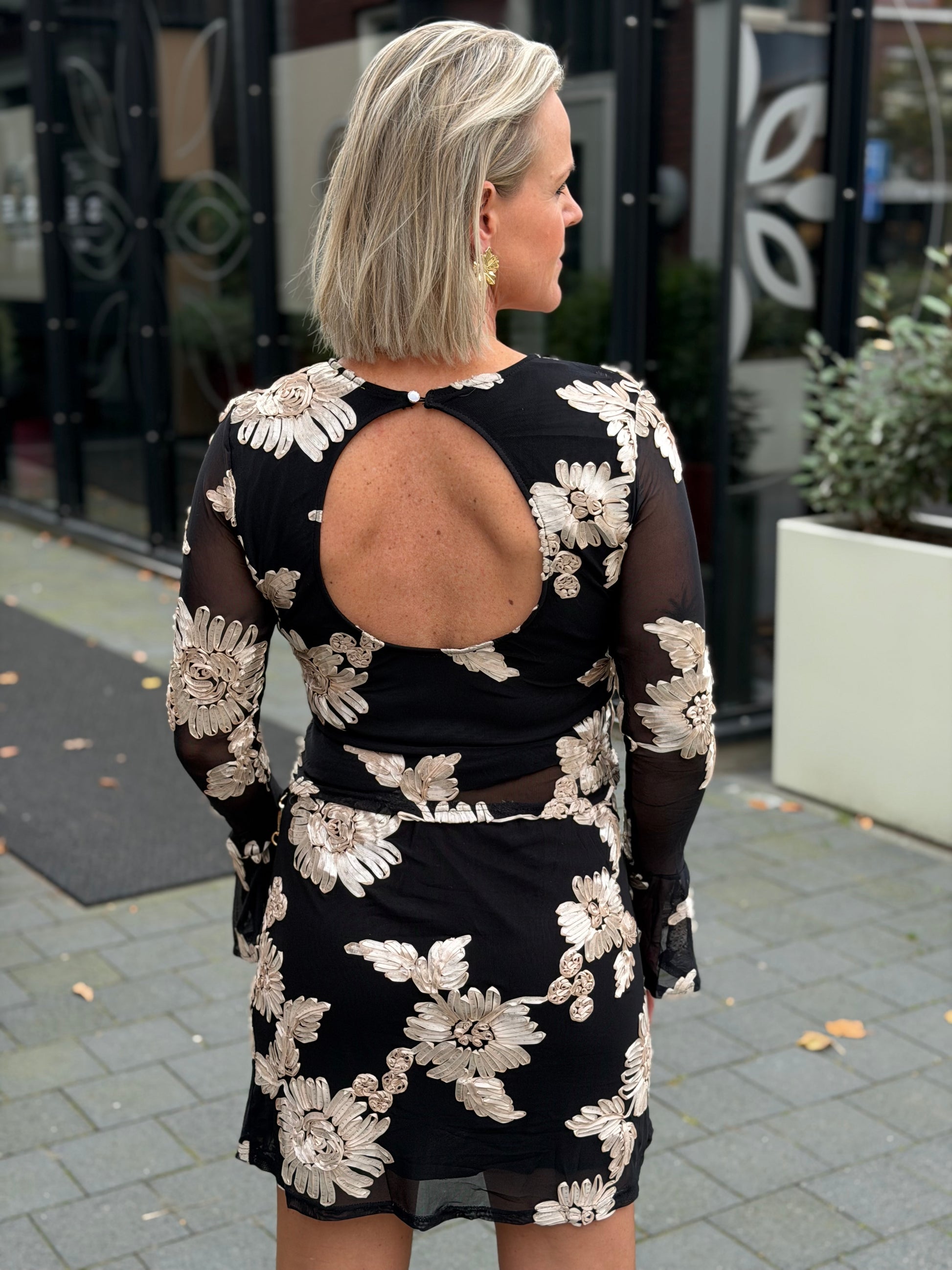 Geweldig mesh setje met top en kort rokje. Het pakje sluit mooi aan en is gemaakt van een mesh stof die bewerkt is met zijde bloemen. Hetboakke heeft veel stretch en is kort